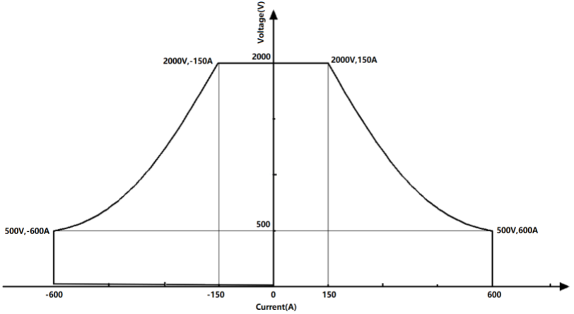 如圖所示,BSL系列BSL 300-2000-600的輸出 I/V曲線(輸 出範圍:300KW,5~2000V,±600A)。